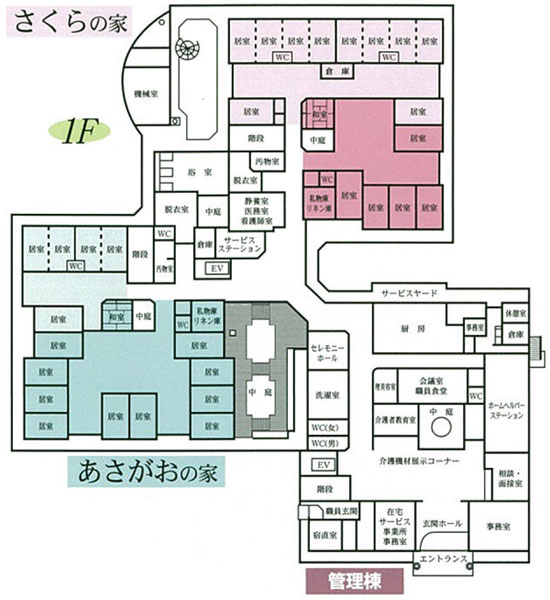 各ユニットごとにキッチンを設けておりフロアごとに基本的な生活が営めるようになっています。
